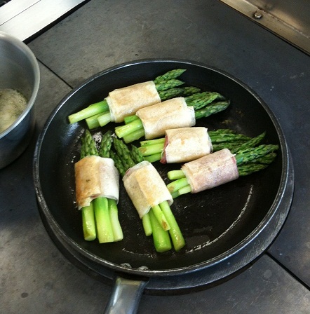 Et une petite recette à base d’asperge pour changer, une idée d’entrée à base d’asperges toute simple, apprise lors de mon cours à l’Institut Paul Bocuse : croquant d’asperges en feuille de brick et jambon de pays.